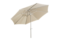 Abriola har en sølvfarvet aluminiumstang i to dele med en diameter på 48 mm. Stangen er udstyret med et håndsving og en automatisk tilt-funktion, som gør det nemt at vinkle parasollen. Parasollens dug er lavet af 250 grams løsningsfarvet stof, komplet med en ventilationsåbning, og understøttes af 8 ribber.