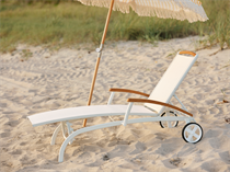 Andy solvogn i hvid aluminium og med hvid textilene og med teak på armlæn og bøjle.