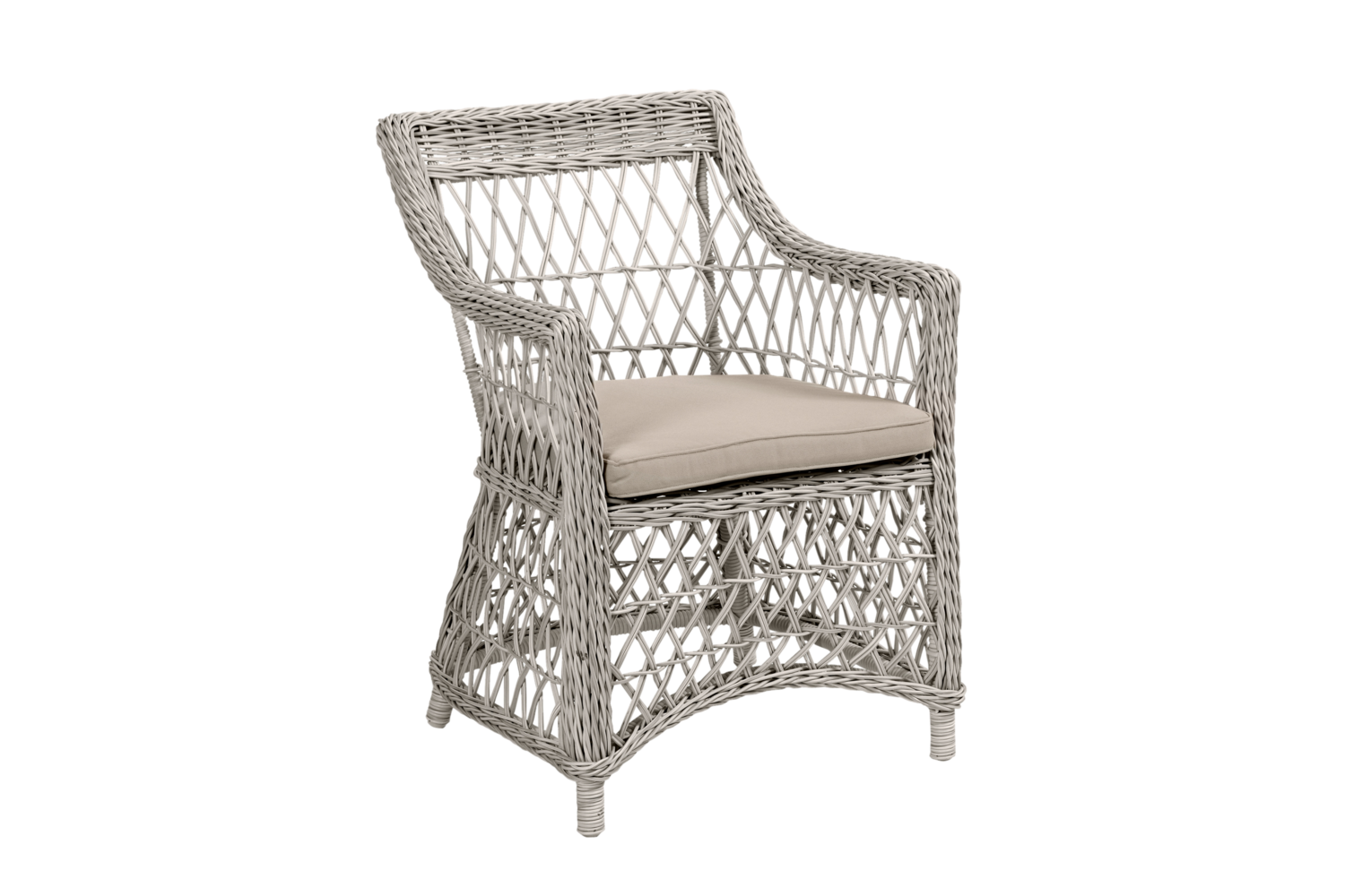 Flot stol i kraftig 5,3 mm hvid polyrattan på aluminiums stel og med beige sædehynde. Stor og rummelig stol der er 60 cm bred og 86 cm høj. Siddehøjden er 47 cm.