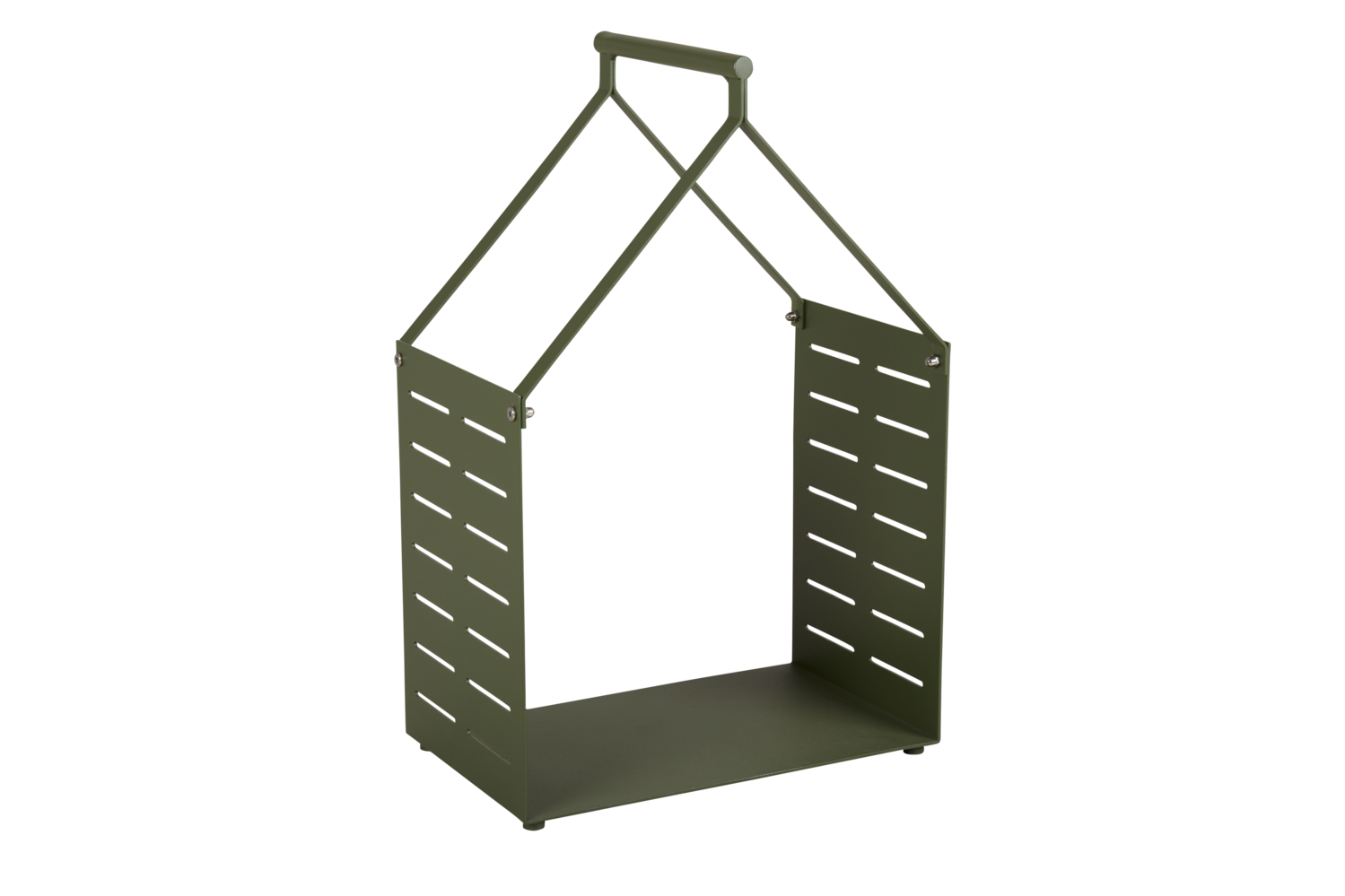 Smart lille opbevaringsstativ til brænde ved siden af bålstedet eller pejsen. Elegant og enkel i grøn pulverlakeret aluminium. Højde 68 cm.