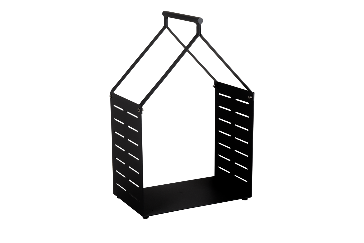 Smart lille opbevaringsstativ til brænde ved siden af bålstedet eller pejsen. Elegant og enkel i sort aluminium. Højde 68 cm.