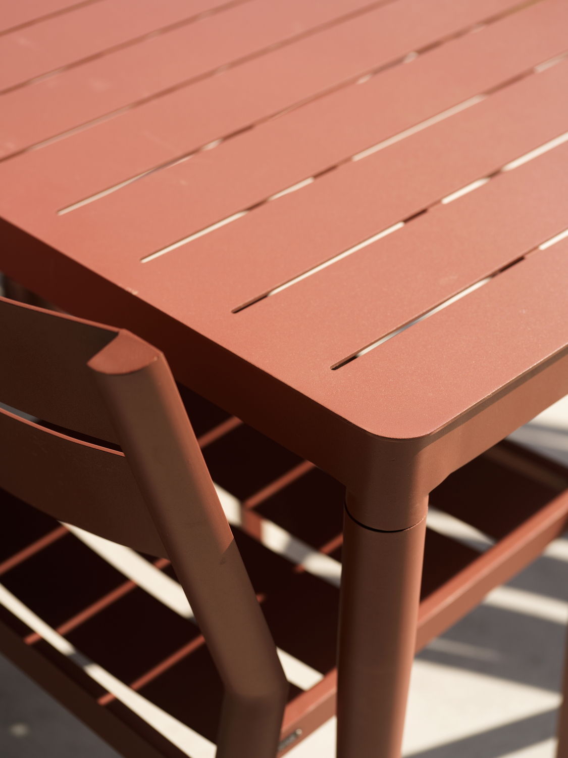 Vedligeholdelsesfrit have/altan bord i ny rødmalet aluminium og med runde hjørner. Bordet måler 90x195 cm og er 73 cm højt. Afstand til underkanten af bordet er 68 cm. Bordet har justerbare ben, så du altid kan få bordet til at stå uden at vippe.