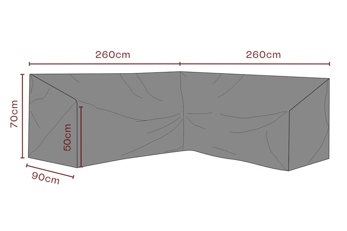 Cover i sort polyester, der er PVC behandlet og vandtæt. Cover til hjørnesofaen måler:260 x 260 cm, er 70 cm højt og 90 cm dyb,