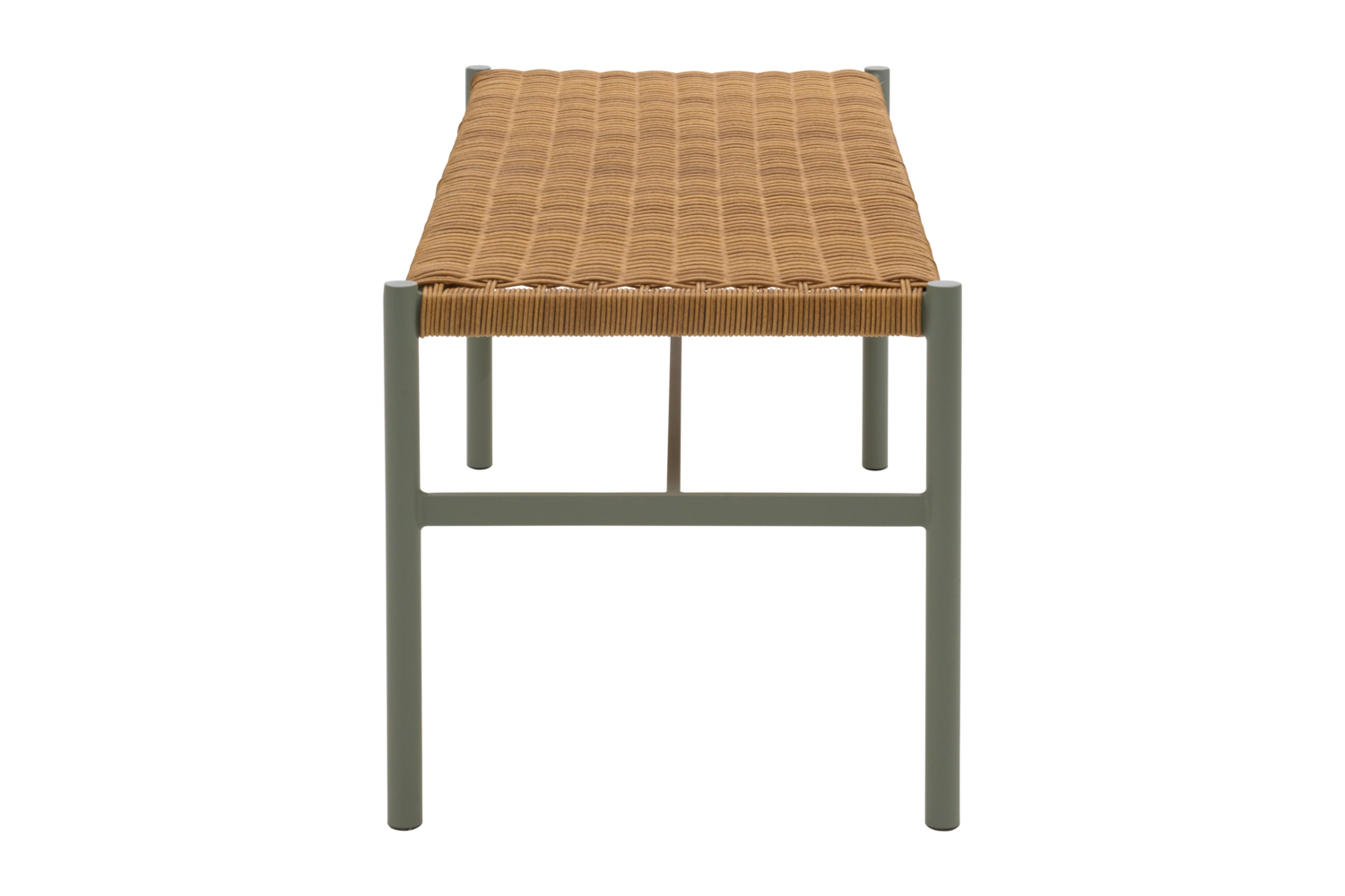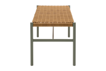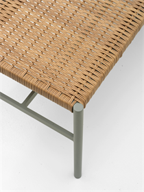 Lille let bænk i med lysegrønt pulverlakeret stel og med flettet sæde i naturfarvet polyrattan. Bænken vejer kun 4 kg så den er let at flytte rundt på og polyrattaen er blød at sidde på, så man behøver ikke hynde.