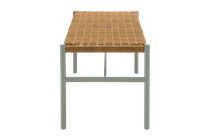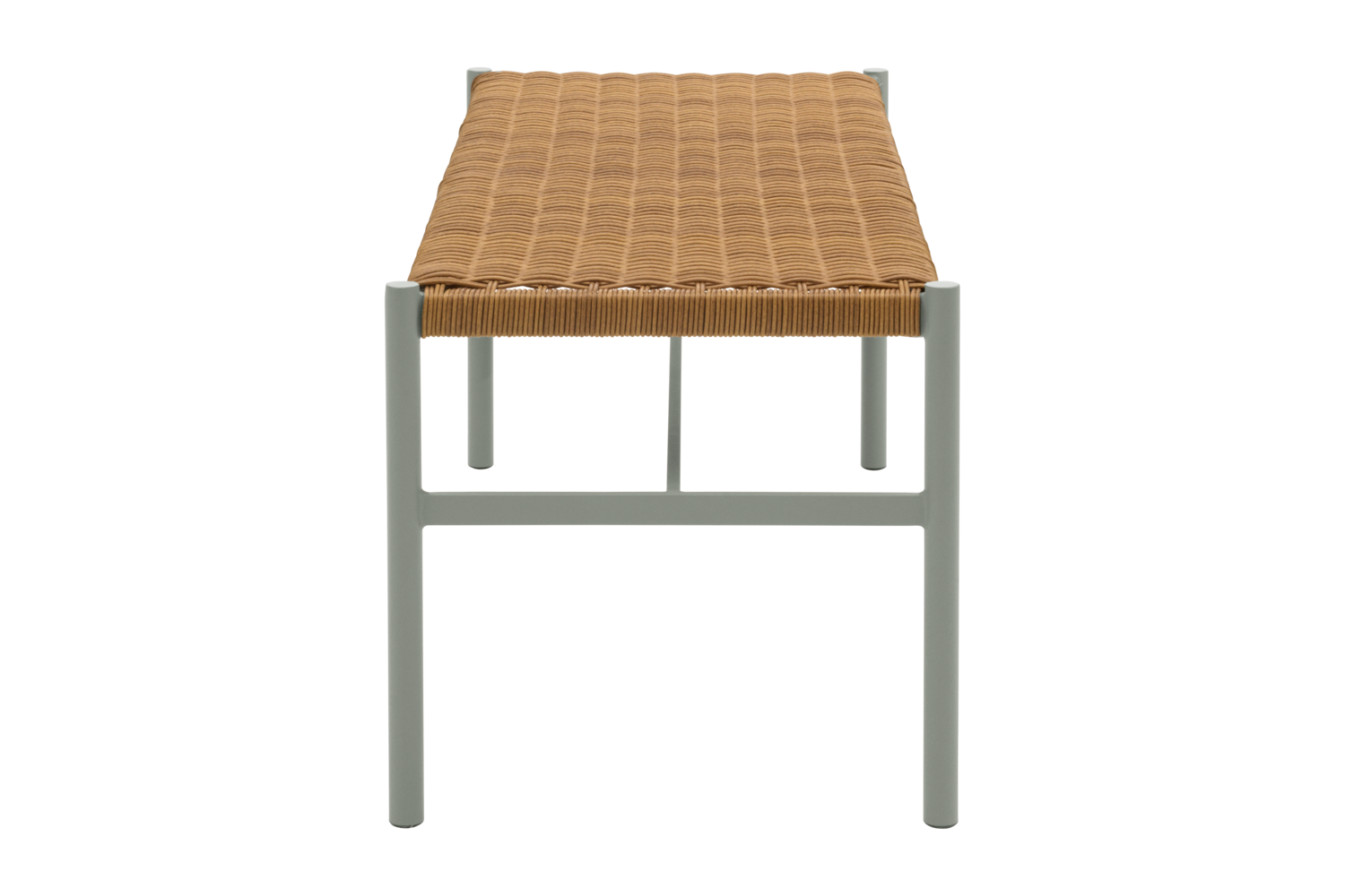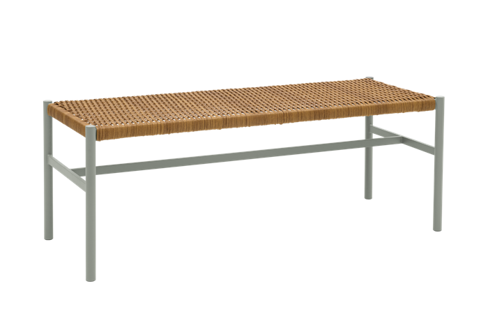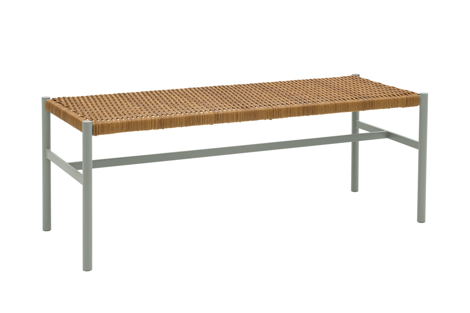 Lille let bænk i med lysegråt pulverlakeret stel og med flettet sæde i naturfarvet polyrattan. Bænken vejer kun 4 kg så den er let at flytte rundt på og polyrattaen er blød at sidde på, så man behøver ikke hynde.