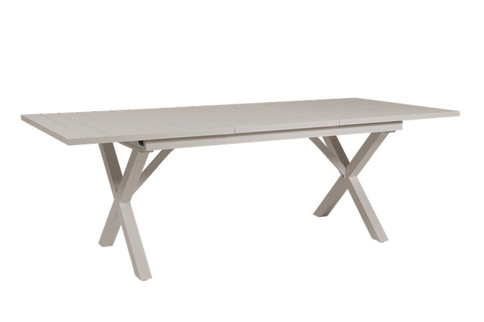 Vedligeholdelsesfrit havebord med udtræksplade. Bordet er 100 cm bredt og 160 cm langt når det er slået sammen, Når det er slået ud er det 220 cm langt - god plads til 10 personer eller flere. Kryds benene gør, at der ikke er nogen bord ben i vejen og dermed er det lettere at "presse" flere ind.