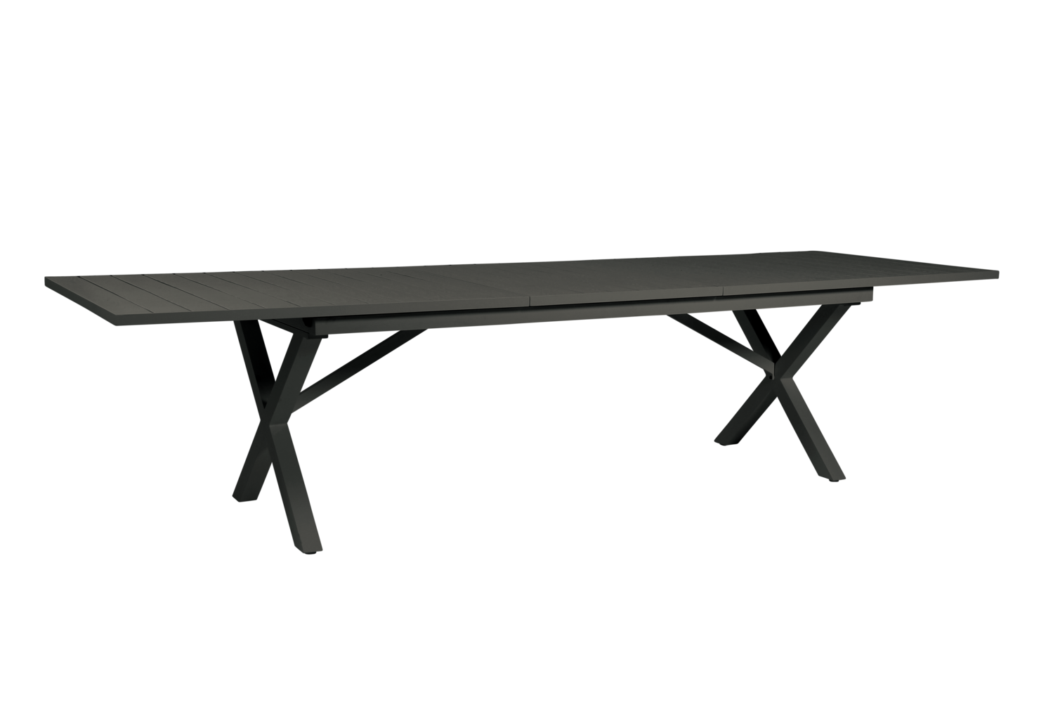 Vedligeholdelsesfrit havebord med udtræksplade. Bordet er 100 cm bredt og 240 cm langt når det er slået sammen, Når det er slået ud er det 310 cm langt - god plads til 12 personer eller flere. Kryds benene gør, at der ikke er nogen bord ben i vejen og dermed er det lettere at "presse" flere ind.