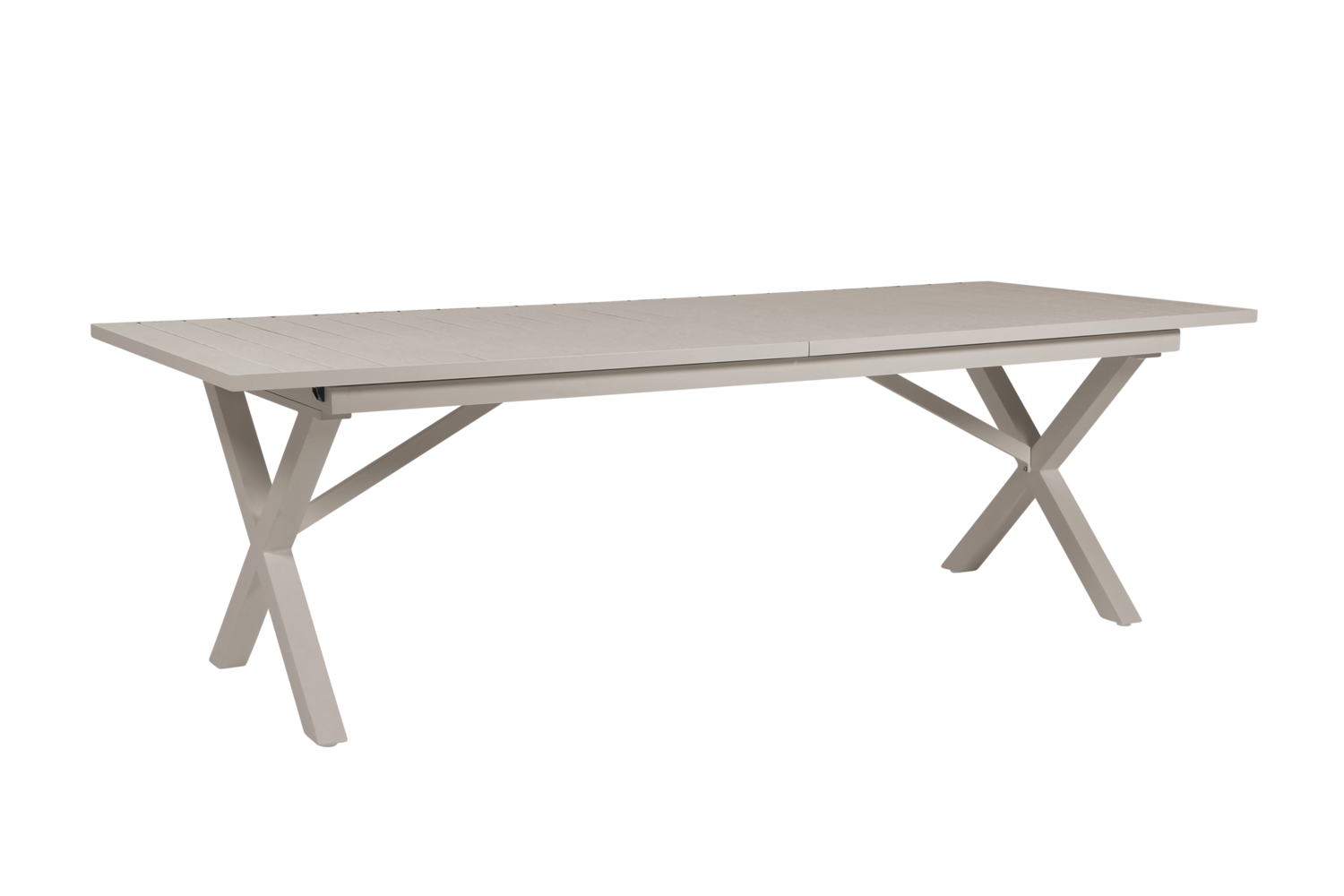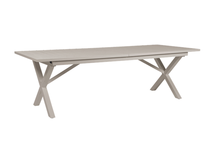 Vedligeholdelsesfrit havebord med udtræksplade. Bordet er 100 cm bredt og 240 cm langt når det er slået sammen, Når det er slået ud er det 310 cm langt - god plads til 12 personer eller flere. Kryds benene gør, at der ikke er nogen bord ben i vejen og dermed er det lettere at "presse" flere ind.