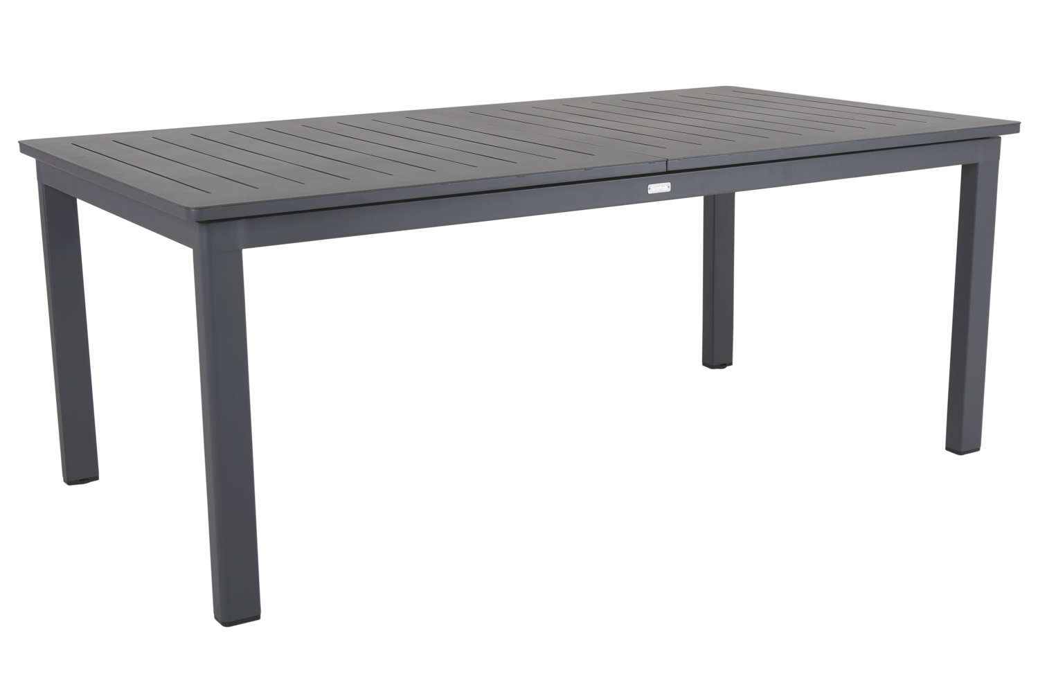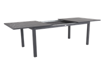 Stort vedligeholdelsesfrit havebord i i aluminium. Der er dog plads til 3 stole mellem benene og en på hver side af bord benene, så med god vilje, kan man sidde op til 14 personer ved bordet. Bordet måler: