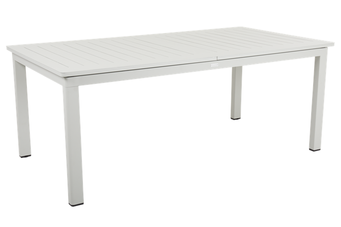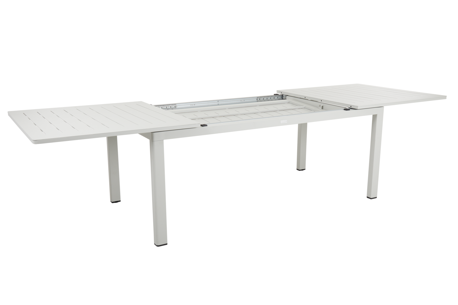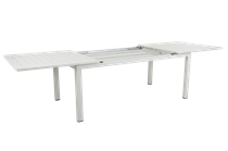 Stort vedligeholdelsesfrit havebord i i aluminium. Der er dog plads til 3 stole mellem benene og en på hver side af bord benene, så med god vilje, kan man sidde op til 14 personer ved bordet. Bordet måler: