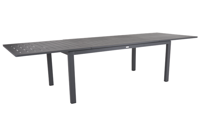 Stort vedligeholdelsesfrit havebord i i aluminium. Der er dog plads til 3 stole mellem benene og en på hver side af bord benene, så med god vilje, kan man sidde op til 14 personer ved bordet. Bordet måler: