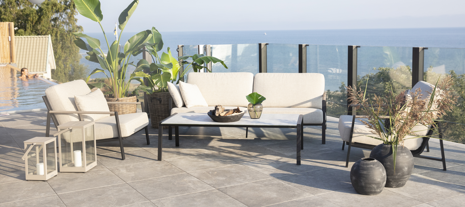 Lyra er et moderne og meget stilfuldt loungesæt i et fint miks af forskellige materialer. Sættet er meget komfortabelt takket være de tykke hynder med modstandsdygtigt skum. De er beklædt med foret olefinstof, som har en vandafvisende belægning på indersiden. Stellet består af sort pulverlakeret rustfrit stål (304) og smukke armlæn med polyrattan. Alt sammen for at modstå forskellige vejrforhold.