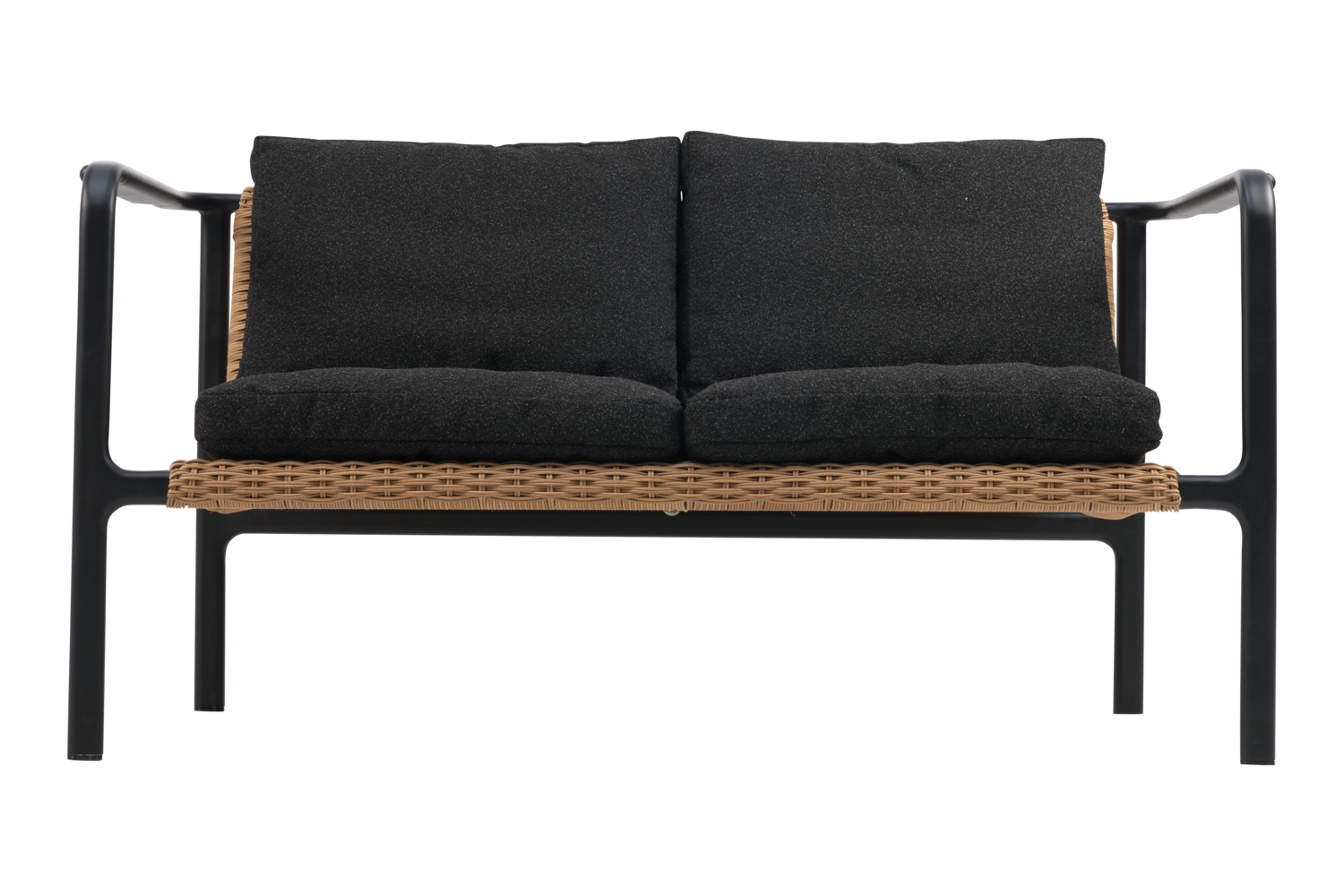 Ny lille 2-personers sofa i let og elegant stil. Udført i aluminium og naturfarvet polyrattan og med tykke og bløde Teddy Beige hynder. Sofaen har følgende mål: