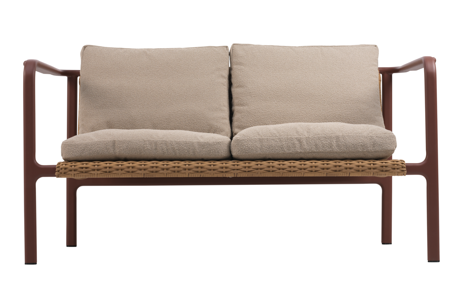 Ny lille 2-personers sofa i let og elegant stil. Udført i aluminium og naturfarvet polyrattan og med tykke og bløde Teddy Beige hynder. Sofaen har følgende mål: