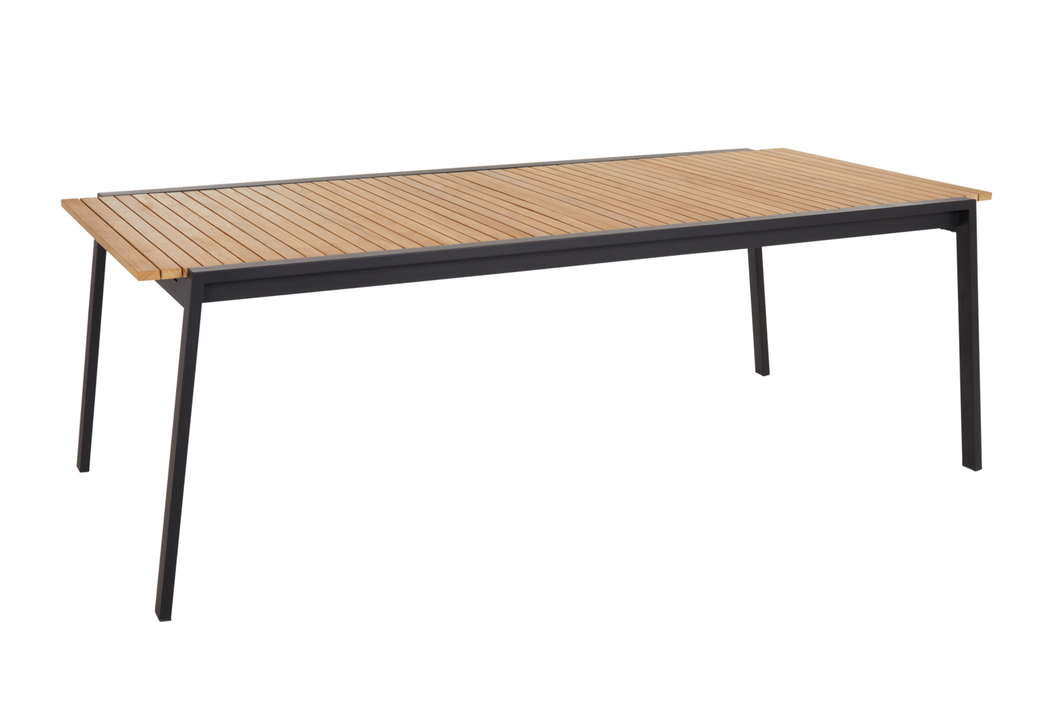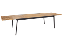 Et luksuriøst spisebord, som virkelig skiller sig ud. De flotte teak-lameller forstærkes af de lige stålben. Til store sammenkomster har bordet desuden skjulte forlængerplader, som foldes ud med en smart butterfly-løsning. Når bordet er foldet ud, er det hele 3,2 m langt.