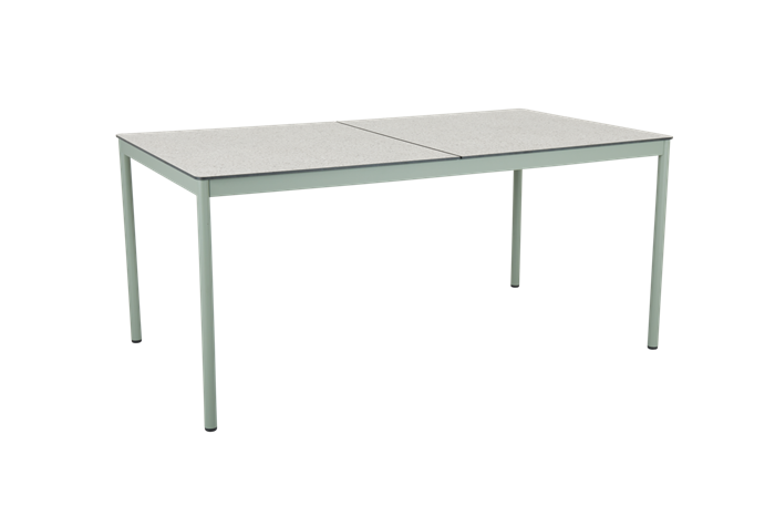 Havebord med aluminiums stel, der er pulverlakeret i en flot dusty green farve og med bordplade i højtrykslaminat, der ligner terrazzo. Benene har justerbare fødder. Bordet måler: