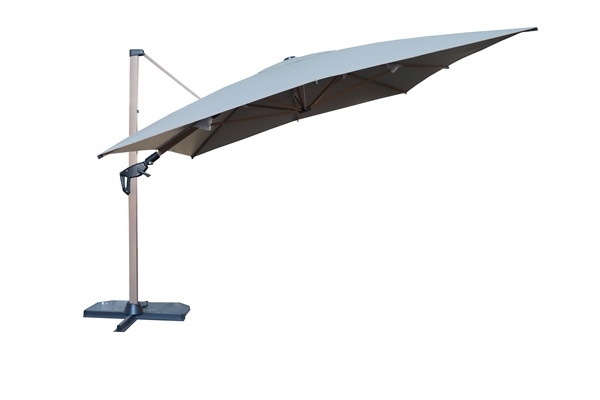 Parasol med indbygget lys, der skaber hygge når det er ved at blive mørkt. Parasollen er i aluminium men er foliebelagt, så det ligner, den er lavet af træ. Dugen er en god kraftig 240g olefin dug. Parasollen kan drejes 360 grader og kan tillige tiltes til højre og venstre. Krydsfod medfølger men sten købes separat.