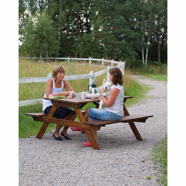 Bord/bænke sæt i brunt trykimpreneret fyrretræ. Bordet måler 71 x 160 cm.